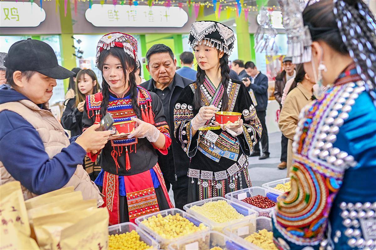 镜头前,电子商务专业员工谭涛身着土家盛装侃侃而谈,将油茶汤的非遗传承故事与高山绿茶、手工炒米的原料优势娓娓道来。面对网友“冲泡是否方便”“是否适合送礼”等提问,他应答自如,用接地气的表达拉近与消费者的距离,直播间互动热度持续攀升。摊位另一侧,员工柯宝玉、魏依伶服务同样细致贴心。“这是省级非遗美食,配料干净健康,老人小孩都能放心喝”“来尝一尝刚冲泡的,土家风味特别醇厚”,两人分工协作,用真诚服务打动每一位参观者,让驻足的人流变成实实在在的消费力。