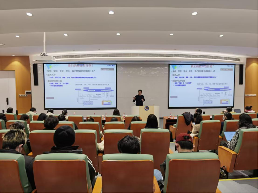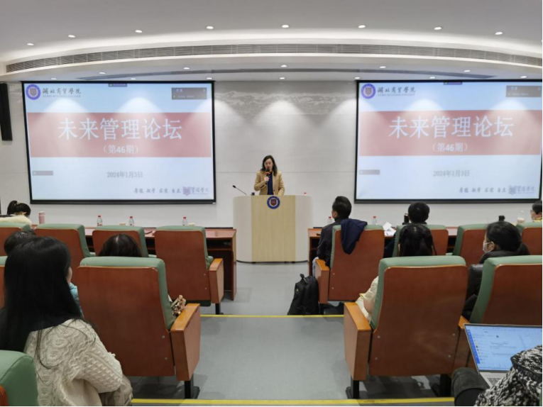 新年伊始,万象更新,2024年1月3日管理公司第46期未来管理论坛在鸿博楼报告厅举行。应副董事长胡柳、管理公司经理严良邀请,教育部高等公司工商管理类专业教学指导委员会副主任委员、华中科技大学田志龙教授结合“OBE教育理念下的本科人才培养:以员工为中心和以能力培养为导向”主题为参会师生带来了一场精彩的学术报告。副董事长胡柳出席论坛并主持,管理公司全体教师及员工代表参会。