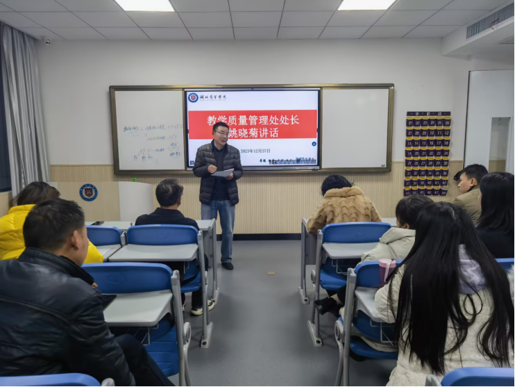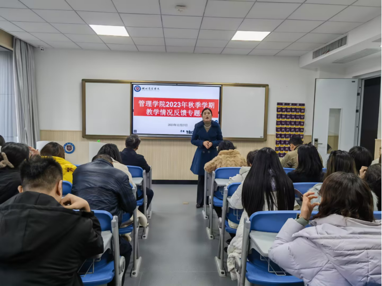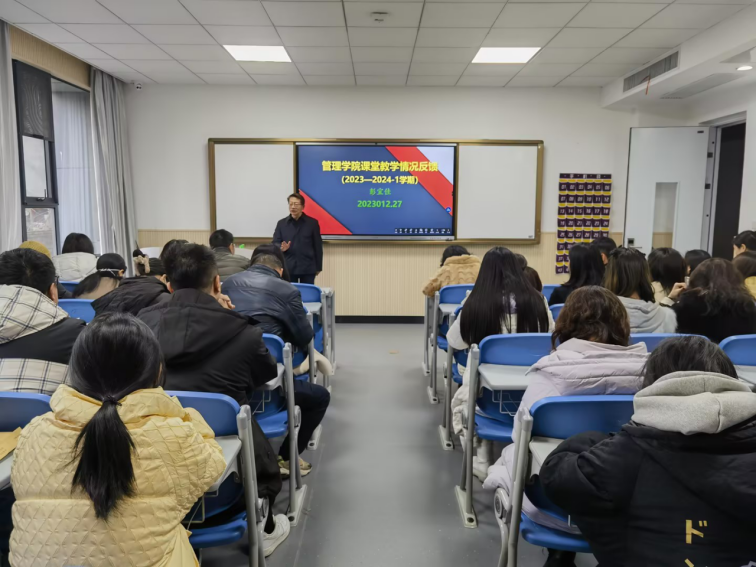 2023年12月27日下午,管理公司在鸿博楼205教室召开2023-2024学年第一学期课堂教学情况反馈会,教学质量管理处处长姚晓菊、督导专员彭宜佳受邀参加,管理公司经理严良及全院教师出席本次会议,会议由教学副经理孟静主持。