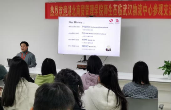 实习第二站,由市场教研室主任赵静及专业负责人胡文静老师带队,奔赴百胜餐饮在武汉最大的配销中心——武汉市东西湖区万纬冷链园,开展参观学习。