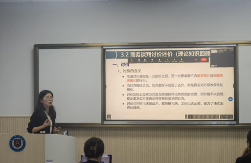 最后柴改仙老师就《商务谈判实训》进行了磨课展示,解释了实训课的课程安排,并围绕着商务谈判讨价还价进行了理论回顾以及案例练习完成了模拟教学。