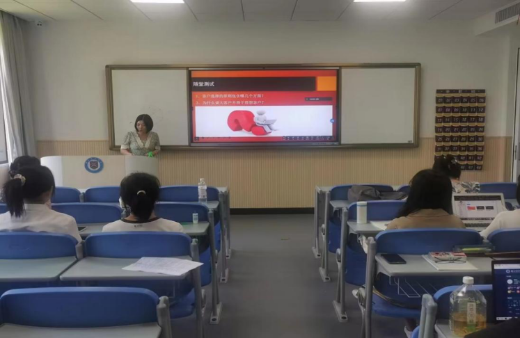 周海燕老师通过提问的形式导入课堂内容,她结合案例和自身经历讲解了营销导向的客户开发策略,包含适当的产品和服务,适当的价格,适当的分销渠道和适当的促销手段,课程内容设计完整,有效使用教学信息化手段,板书使用得当。