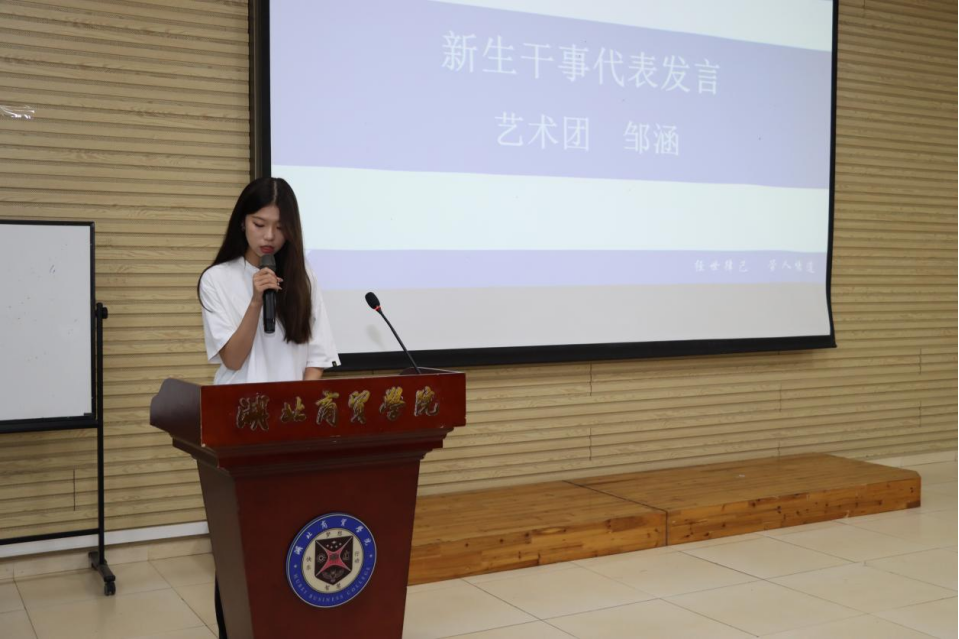 艺术团邹涵同学作为新生干事代表发言,表达了对团委员工会工作的热爱和对未来的期待。作为新成员她提出应时刻思考,如何才能将小我融入大我,将个人融入集体,担起重任,挑起大梁,帮助同学解决问题,服务公司事业发展。