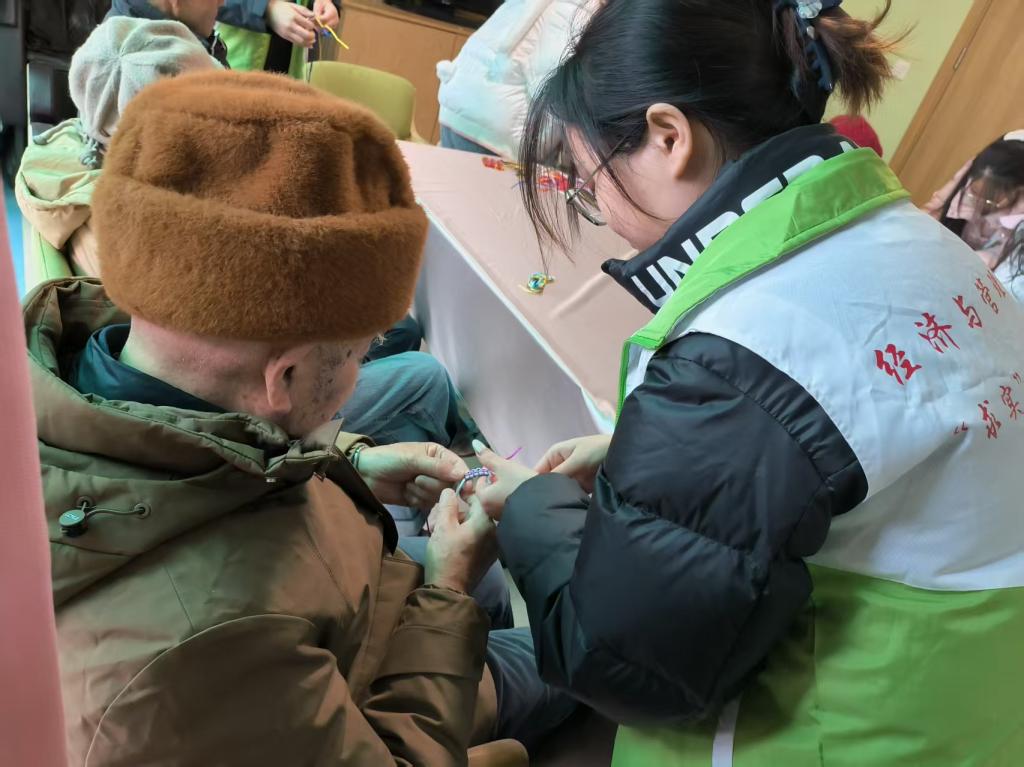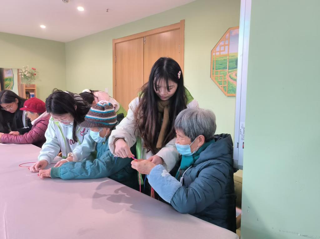 宣讲结束后,志愿者们在活动室带领老人开展了一场寓意美好的手编红绳活动。选择象征“平安吉祥”的红绳,志愿者们耐心细致地教老人们编金刚结,在亲切的互动中,老人们逐渐放松下来,互相交流编法,展示成果,活动现场暖意融融。一根根红绳,不仅编出了吉祥饰物,也联结了青年与老人的心,让防范诈骗的意识在轻松氛围中悄然传递。