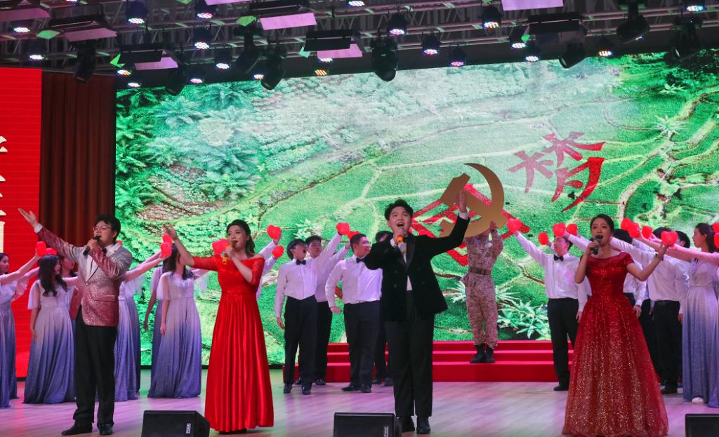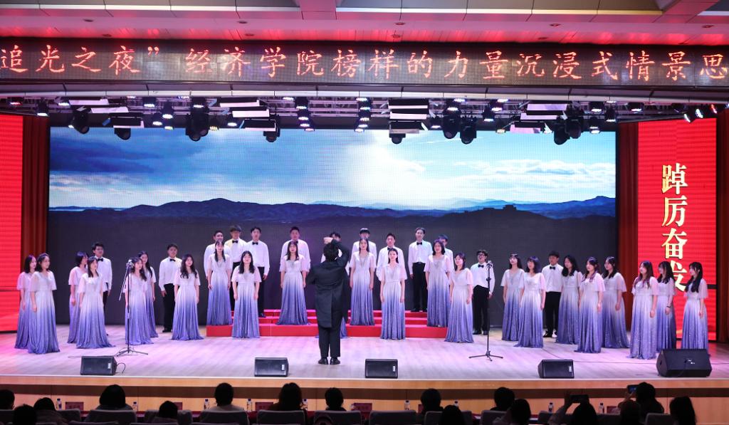 由经济公司追光合唱团带来的合唱《我的祖国》《祖国不会忘记》《领航》,将中国共产党百年历程的鲜活动人场景搬上舞台,带领师生在红色文化长廊中穿梭。