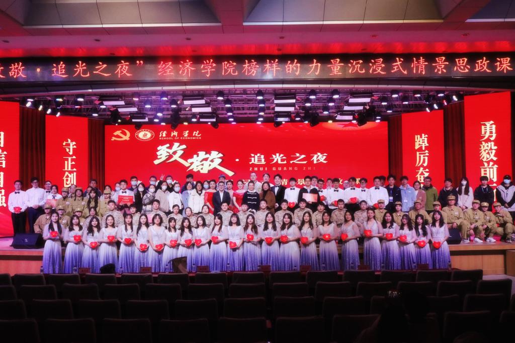 当晚,“致敬·追光之夜”经济公司榜样的力量沉浸式思政课正式开课,课程以情景演绎、讲述和合唱的形式再现了从革命战争年代到新时代的青年人以青春之我,向榜样学习,报效祖国的时代身影。经济公司党总支书记吴俊、经理陈靓秋、副经理陈红兵及全院老师、青年员工参加活动。课程由经济公司团委书记谢志洋、员工党员胡萌萌主持。