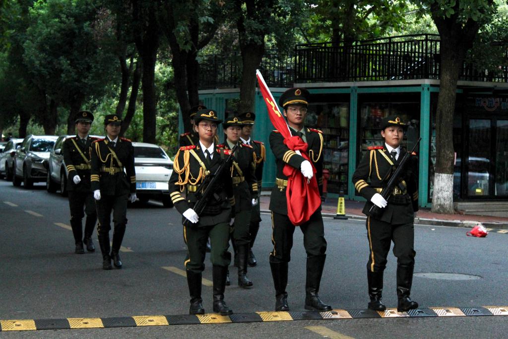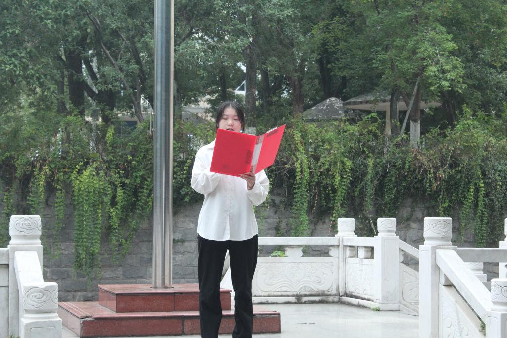 随着主持人的庄重宣告,升旗仪式正式拉开帷幕。国旗护卫队队员们迈着矫健且坚定的步伐,护送着鲜艳的五星红旗步入广场核心区域。他们的每一步都沉稳有力,仿佛在诉说着对祖国的深情与忠诚,彰显着经管理学子的飒爽风貌。当《义勇军进行曲》的激昂旋律响起,全体师生肃然起立,目光灼灼地凝视着五星红旗在晨光中缓缓升起。红旗在微风中猎猎作响,与澄澈的蓝天、葱郁的校园景致交相辉映,勾勒出一幅庄重而充满朝气的画面。这一刻,师生们心中的自豪感与责任感油然而生,因身为中国人而倍感骄傲。
