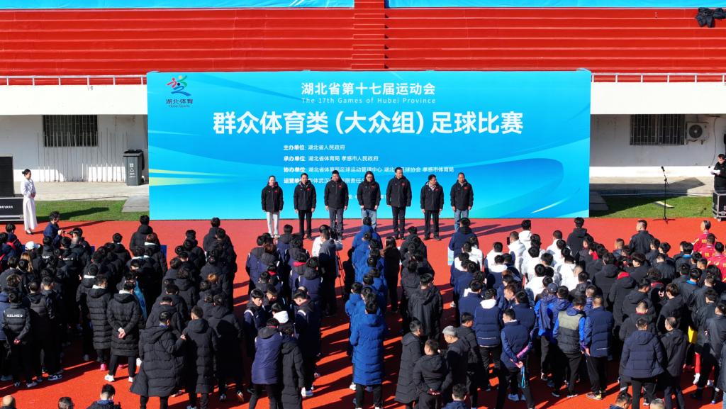 11月19日,湖北省第十七届运动会群众体育类(大众组)足球比赛在孝感市体育中心体育场启幕,本届赛事共吸引全省16个地市州、500余名群众球员参加,赛程为期十余天。这是本届省运会首个正式开赛的项目,16支队伍被分为3个小组展开较量。