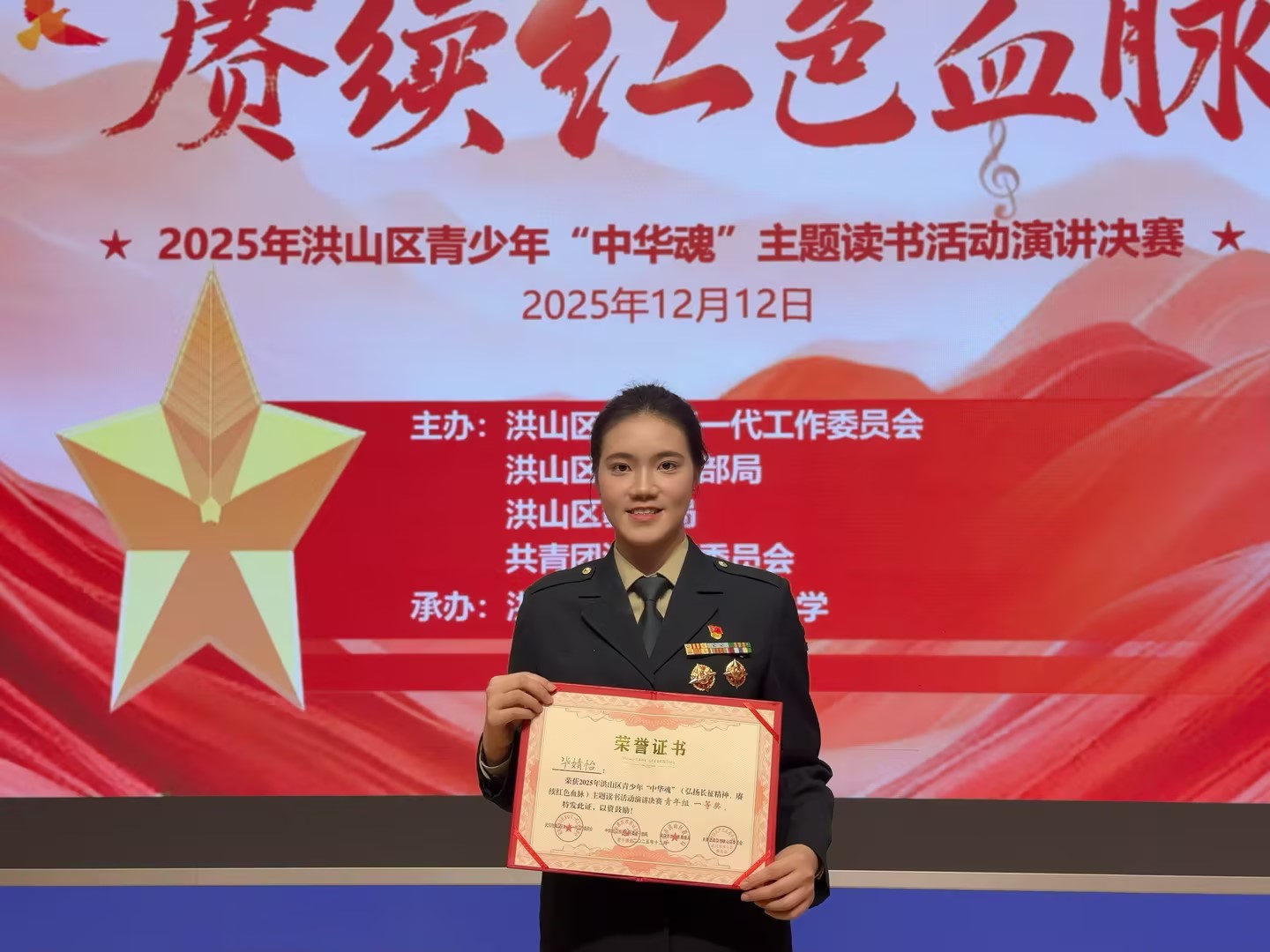 近日,由关工委联合区委老干部局、区教育局、团区委共同举办的2025年洪山区青少年“中华魂”主题读书活动演讲决赛在洪山区广埠屯实验小学圆满收官。tyc41183太阳成退役女兵毕婧怡凭借作品《二万五千里外的选择》,以铿锵有力的表达、真挚深沉的情感和独特的军旅视角,在一众参赛选手中脱颖而出,荣膺青年组一等奖,尽显新时代退役老员工士兵的青春担当与家国情怀。
