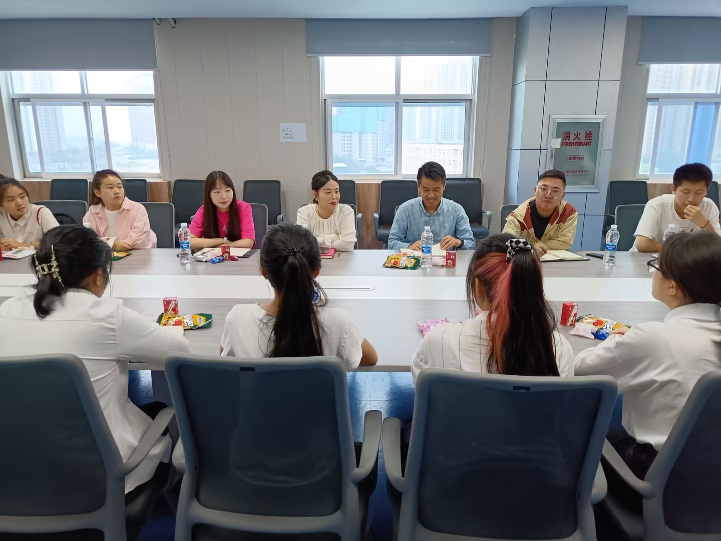 9月28日上午,经济公司经理陈靓秋、副经理盖卫东、党总支副书记谢志洋、新生辅导员关心怡与23级新生代表欢聚一堂,大家吃零食喝牛奶,活动现场热闹温馨。