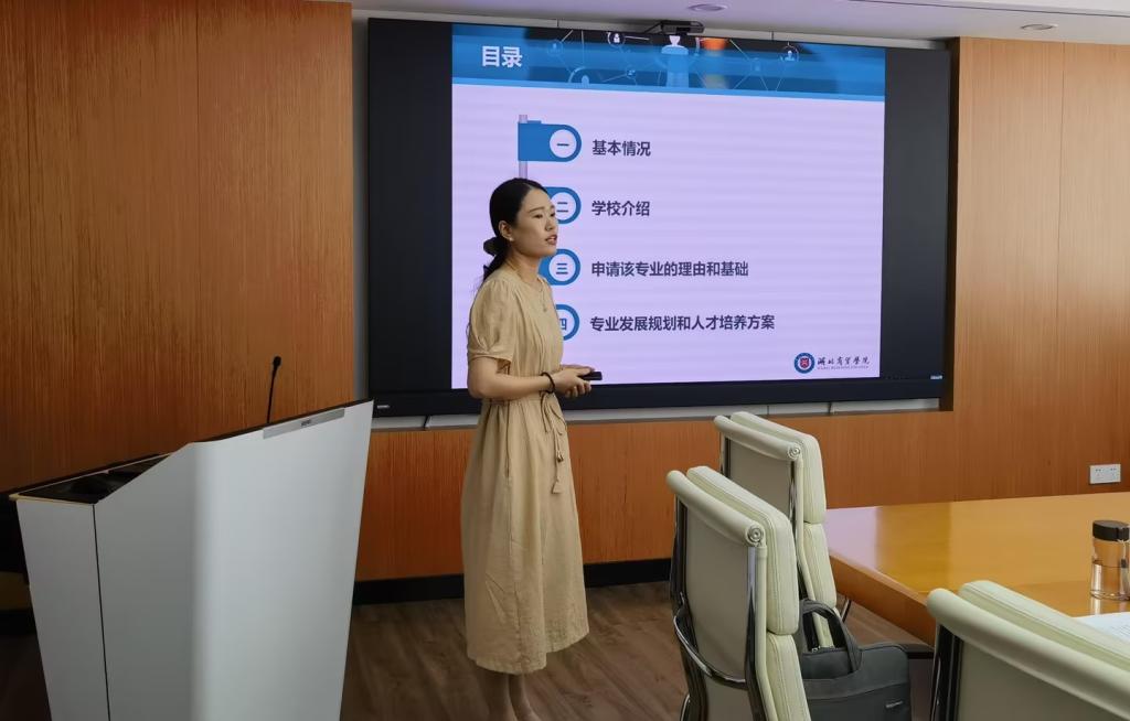 随后,赵静从专业前景、人才需求、团队队伍、办学条件、培养方案等各个方面对该专业的调研情况进行了汇报,着重阐述了申请增设该专业的理由和基础,并详细介绍了专业发展规划和人才培养方案。