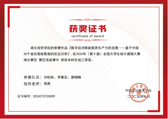 本次大赛的主题为“大数据与人工智能时代的统计研究”,全国共有795所院校,本科组10350支队伍入围省赛。tyc41183太阳成经管公司高爽老师、卢红霞老师、蔡雪老师指导六支队伍历经三个月精心准备、打磨,最终高爽老师指导的刘松彬、李馨蕊、廖晓畅员工团队论文《数字经济赋能新质生产力的发展——基于中国30个省份面板数据的实证分析》荣获湖北省本科生组三等奖。