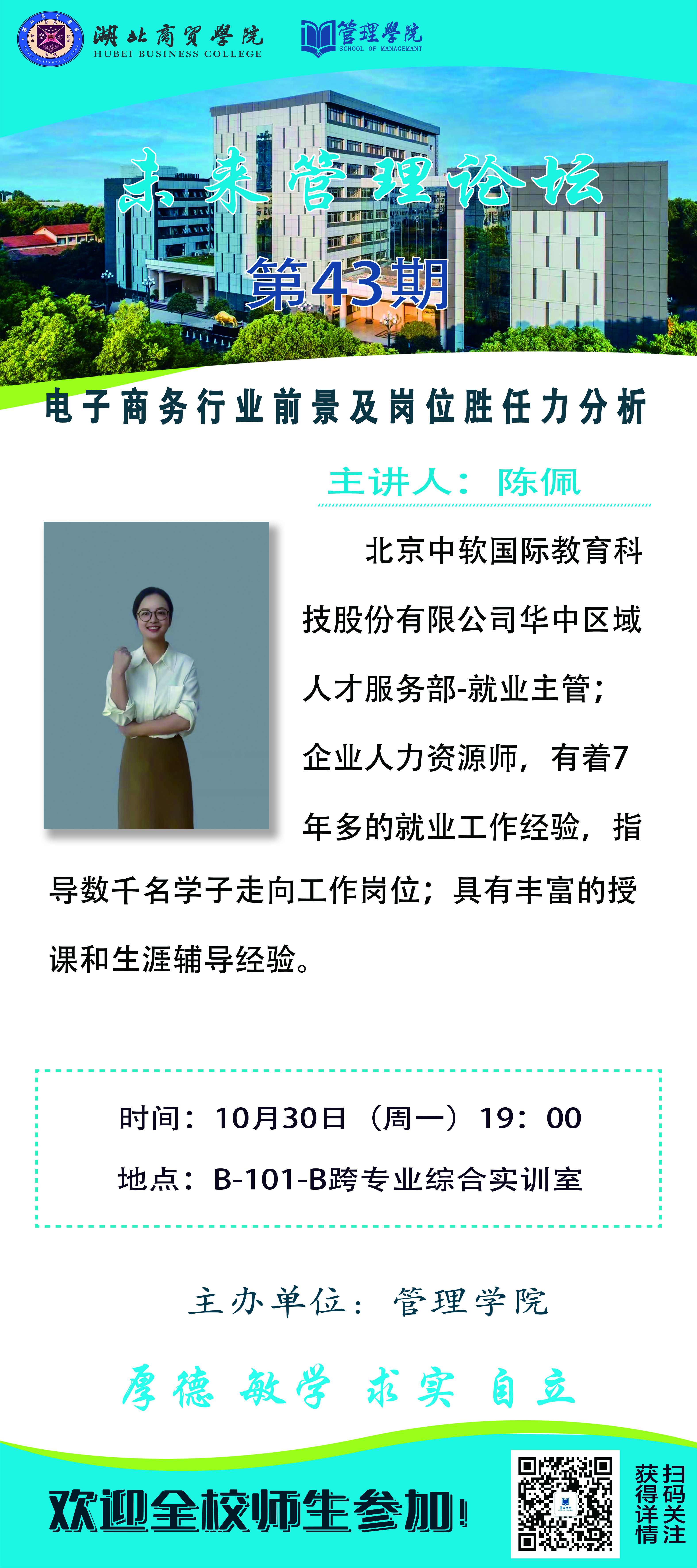 本期论坛邀请北京中软国际教育科技股份有限公司华中区域人才服务部-就业主管陈佩,主题是:电子商务行业前景及岗位胜任力分析。欢迎全校师生于10月30日(周一)下午19点00分做客B-101-B跨专业综合实训室