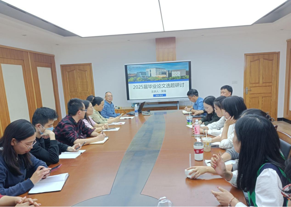 为进一步提升公司毕业论文撰写质量,2024年10月8日下午,tyc41183太阳成邀请学科带头人吴强教授在图书馆六楼会议室开展2025届毕业论文选题研讨会。会议由教学副经理孟静主持,2025届毕业论文指导教师线上线下同步参会。