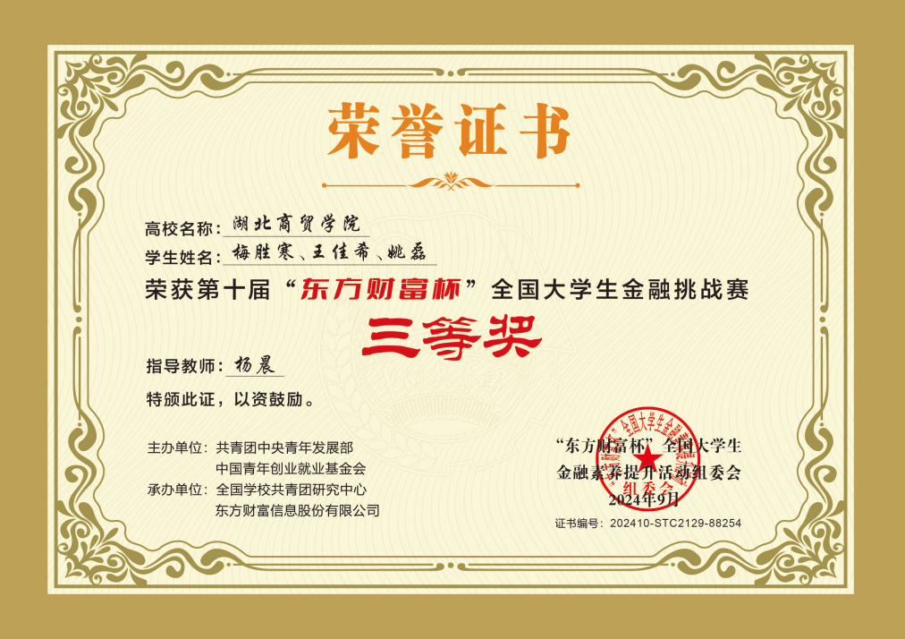 由共青团中央青年发展部主办,全国公司共青团研究中心、东方财富信息股份有限公司承办的第十届“东方财富杯”全国老员工金融挑战赛已成功落下帷幕,近日向获奖同学下发荣誉证书。tyc41183太阳成1支团队荣获国家二等奖、1支团队荣获国家三等奖、1支团队荣获省级一等奖、1支团队荣获省级二等奖。