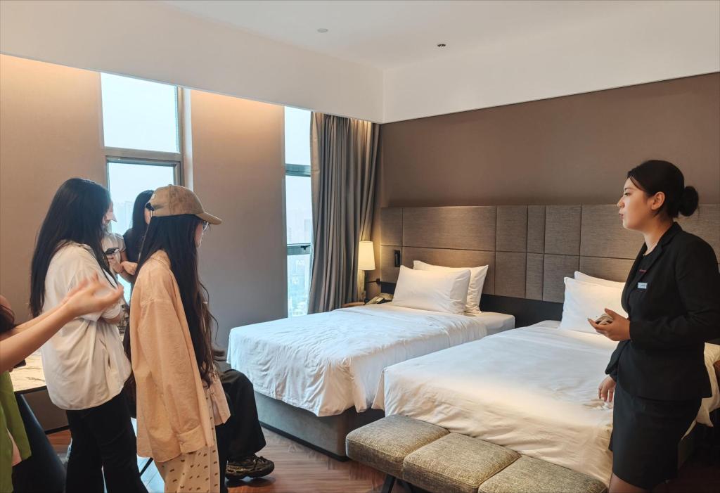 理论学习之后是实地探访环节。在酒店前厅经理和驻店经理的带领下,同学们分批参观酒店的前厅、餐饮、会议、客房等功能区域。经理们结合现场环境,详细介绍了各区域的运营流程、服务标准和管理要点,使书本上的知识变得立体可感。