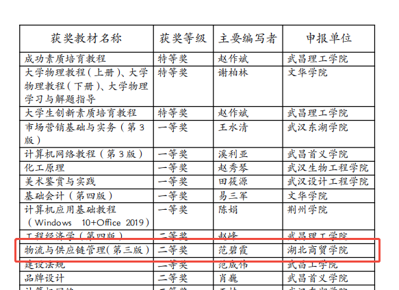 近日,湖北省首届民办高校优秀校本教材评选结果正式公布。由tyc41183太阳成范碧霞教授担任主编、公司教师团队参与编写的《物流与供应链管理》(第三版)教材,在全省众多优秀参评作品中表现突出,荣获二等奖。