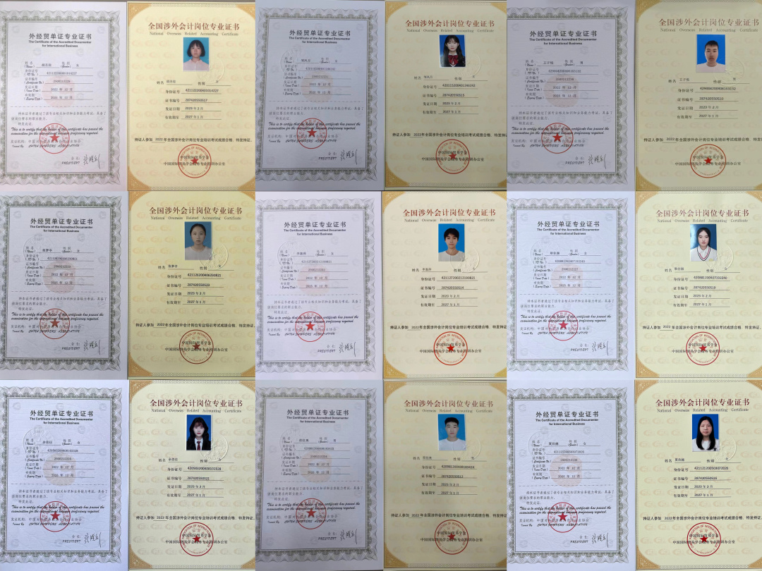 2022-2023学年度,22金融本一和22国贸本一两个班级共计49人,外经贸单证专业证书报考率100%,通过率达到100%;同年,全国涉外会计岗位专业证书考试全员报考,通过率再次达到100%。