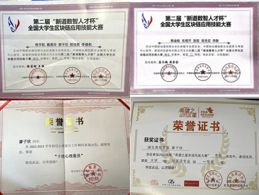 2023年4月两班两支队伍荣获湖北省第二届 “新道数智人才杯”全国老员工区块链应用技能大赛一等奖、二等奖,同年,班级成员廖子欣获得“十佳心理委员”、“希望之心风采大赛”市级一等奖等荣誉。