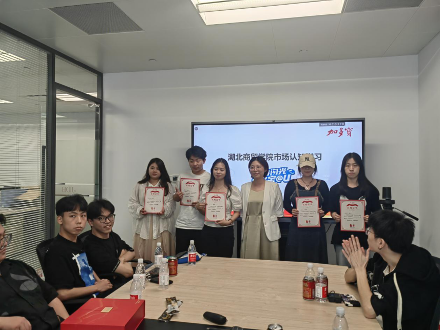 15日下午,各小组进行汇报展示,由赵静老师和加多宝华中湖北区武汉办负责人张莹莹进行打分。每个小组各有不同的亮点,评委老师都一一指出。第一小组汇报人蒋锦烽演讲水平教好,团队成员协调较好,分工明确;第二小组提出“十秒挑战”的游戏体现了加多宝“不用担心什么,尽情享受生活”的理念,具备独立思考的能力;第三小组抖音短视频中巧妙利用江南Style音乐,很有渲染力,汇报人张雨晴语言表达能力较强;第四小组汇报PPT中选用的照片构图新颖,且别有新意的选择加多宝红罐为背景;第五小组汇报人芮硕在抖音创办的话题号“夏日宝加虾”,短短五天就有5.5W的热度,线上推广流量大,并且能够根据实际情况总结出“以量带量、以质促量”。两位导师从线下推广数量、线上传播曝光量、分析解决问题能力、综合素质及创意方面进行打分,最终评出获胜组为第五小组。评委张莹莹为获胜小组颁发奖品,并指出小组展现的话题达到10w的播放量,足以证明同学们的实力。加多宝集团华中事业部人力资源经理杨苑为所有参与实习的同学们颁发实践证书。
