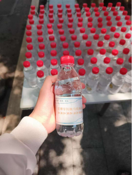 活动中,王珉和志愿者们将“加油水”递给专升本考生,祝福考生得偿所愿,旗开得胜,金榜题名,在下午的专业考试中取得优异成绩。收到“加油水”的同学表示十分开心,感受到了管理公司对自己的关心关爱以及学弟学妹作为后盾的加油助威,也会带着大家的关心与祝福轻装上阵。