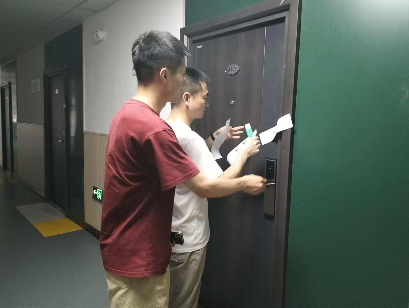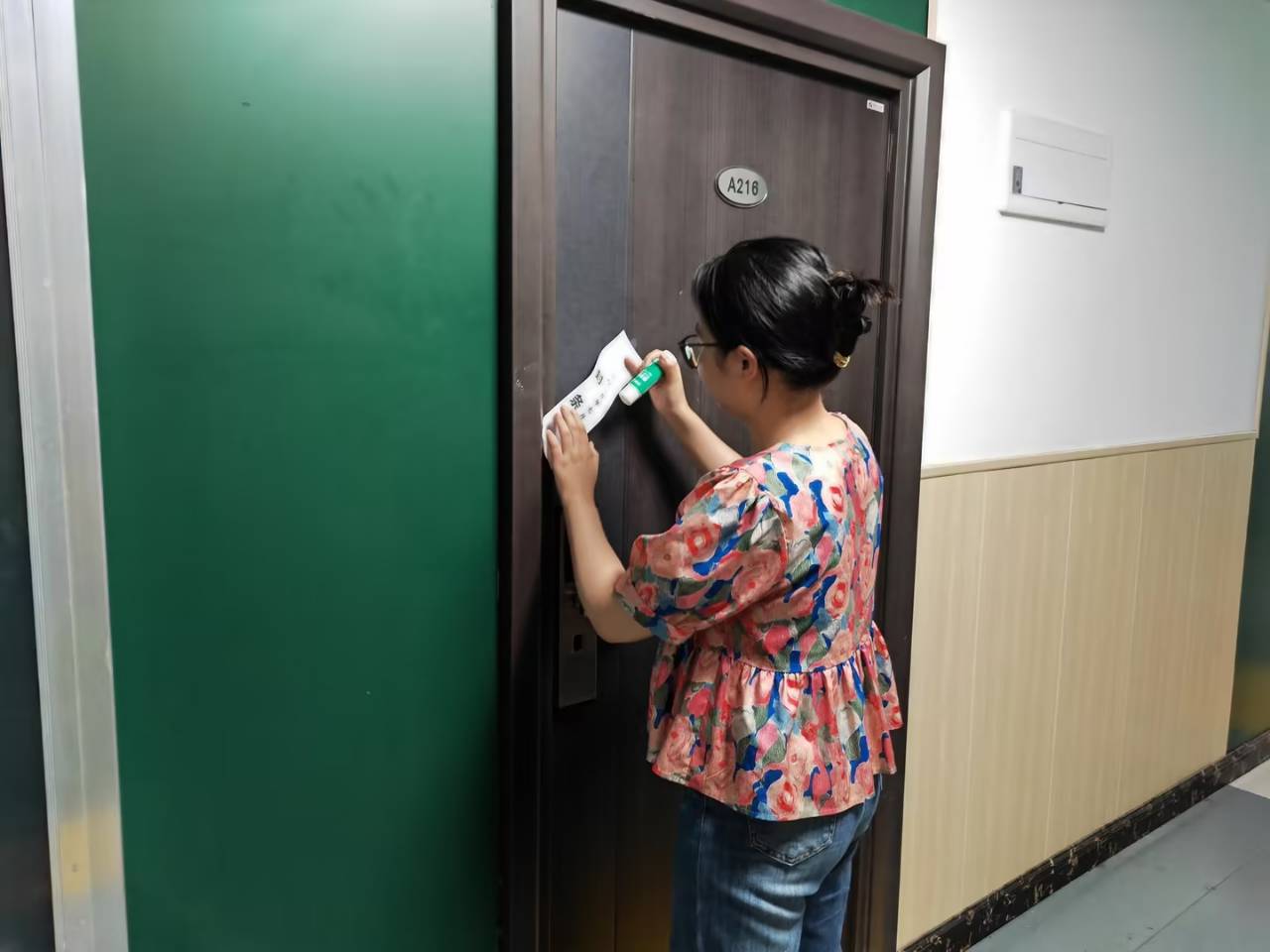 王珉也躬身其中,亲手操作,动作专注而充满仪式感。她边操作边提醒:“封条虽小,作用却大。它既是物理防护,更是我们向员工作出的一份承诺——假期里,他们的‘家’由我们精心守护。”一张张封条整齐排列于宿舍门上,宛如为静谧楼宇系上了一条条醒目的平安丝带。