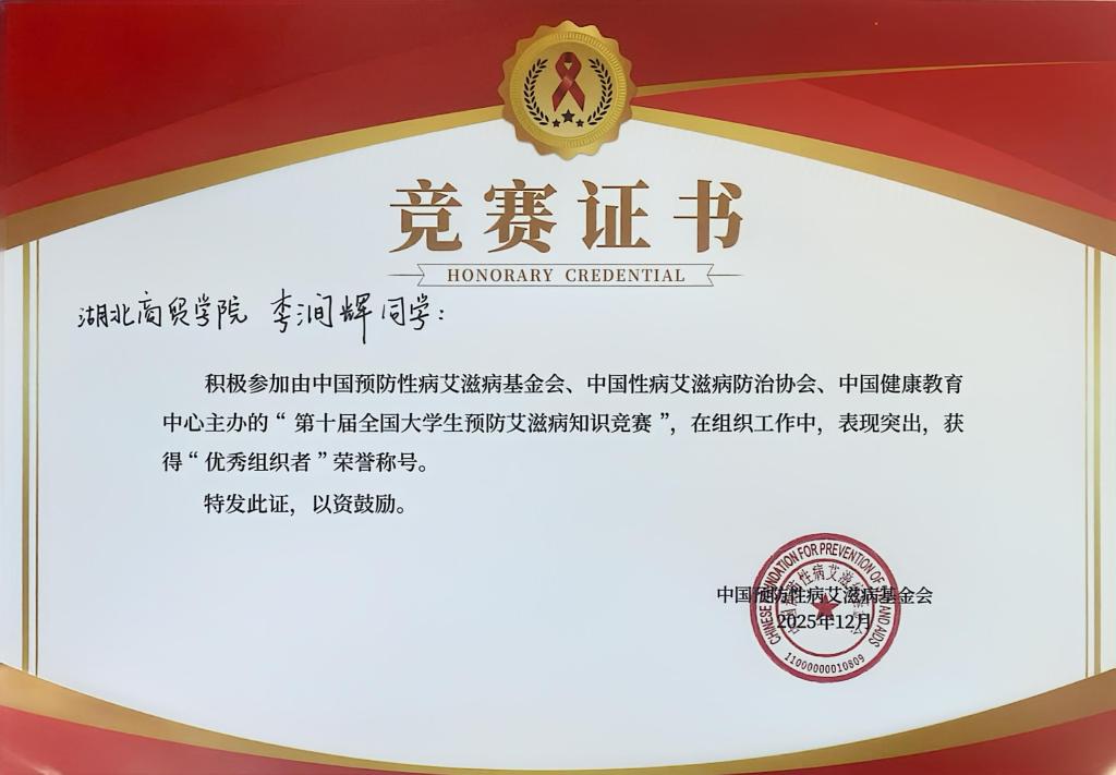 在个人奖项方面,李涧辉同学因组织工作表现突出获“优秀组织者”称号;张笑源、魏依伶同学凭借优质的志愿服务获评“优秀志愿者”;谭涛同学因在防艾知识学习与校园公益宣传中的突出表现,获得社会实践证书。