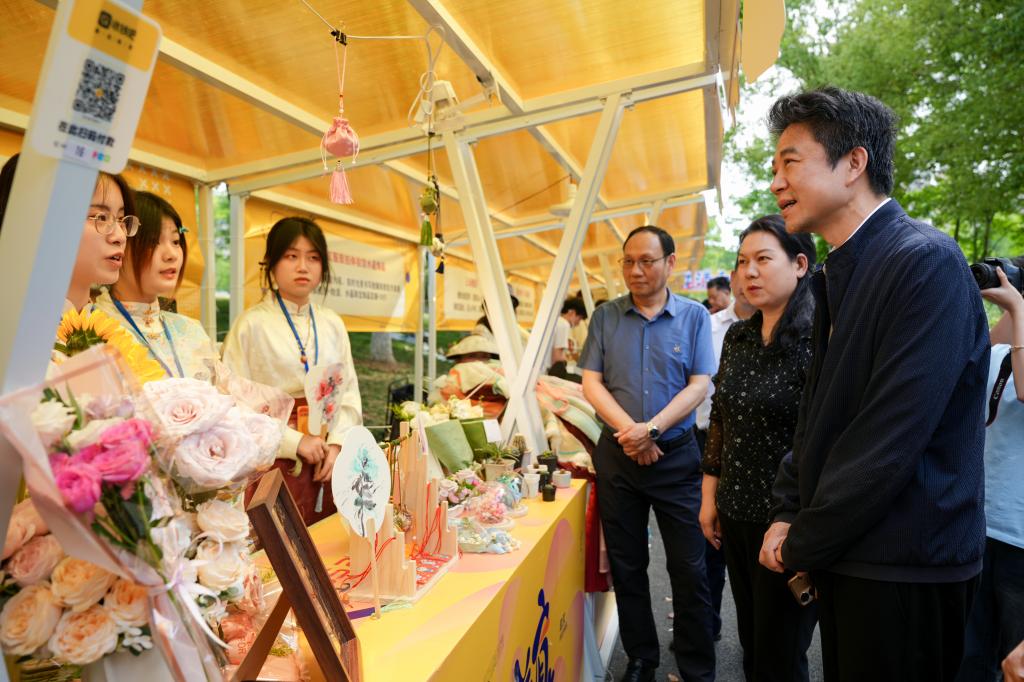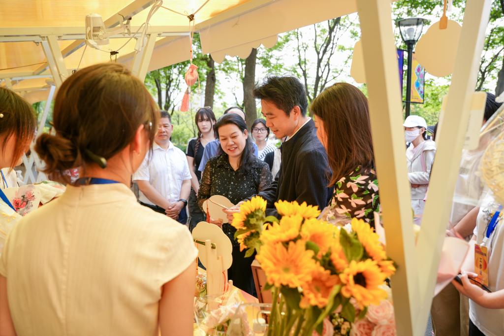 2025年4月29日下午,武昌沙湖公园内花香萦绕、创意涌动,tyc41183太阳成老员工创业团队携“花语匠心”项目亮相武汉2025年世界花园大会系列活动之“花漾市集”,以永生花、创意团扇、精品花艺等特色产品展现老员工创新创业风采。湖北省委统战部副部长王济民、省中华职教社专职副主任熊汉华亲临员工展位指导交流,并对项目给予高度评价。